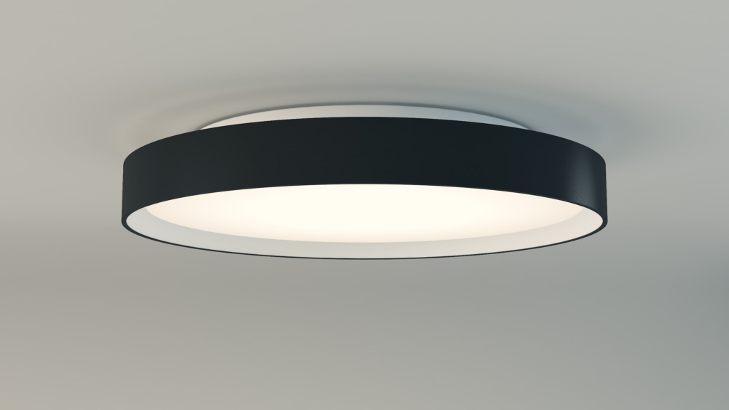 Runde Wand-/Deckenleuchte in bicolor Optik, direkt-/indirektstrahlend. Gehäuse aus Aluminiumprofil schwarz-struktur pulverbeschichtet (RAL 9005) und weiß pulverbeschichtetem Blendring. Lichtverteilung direkt über einen opalen LED-Diffusor, mattiert, zur Vermeidung von Reflexionen Zweiteiliges Leuchtengehäuse, montagefreundlich durch Bajonettbefestigung, ohne sichtbare Verschraubung. Leuchte mit 4 Kabeleinführungen für mittige und außermittige Einspeisung.